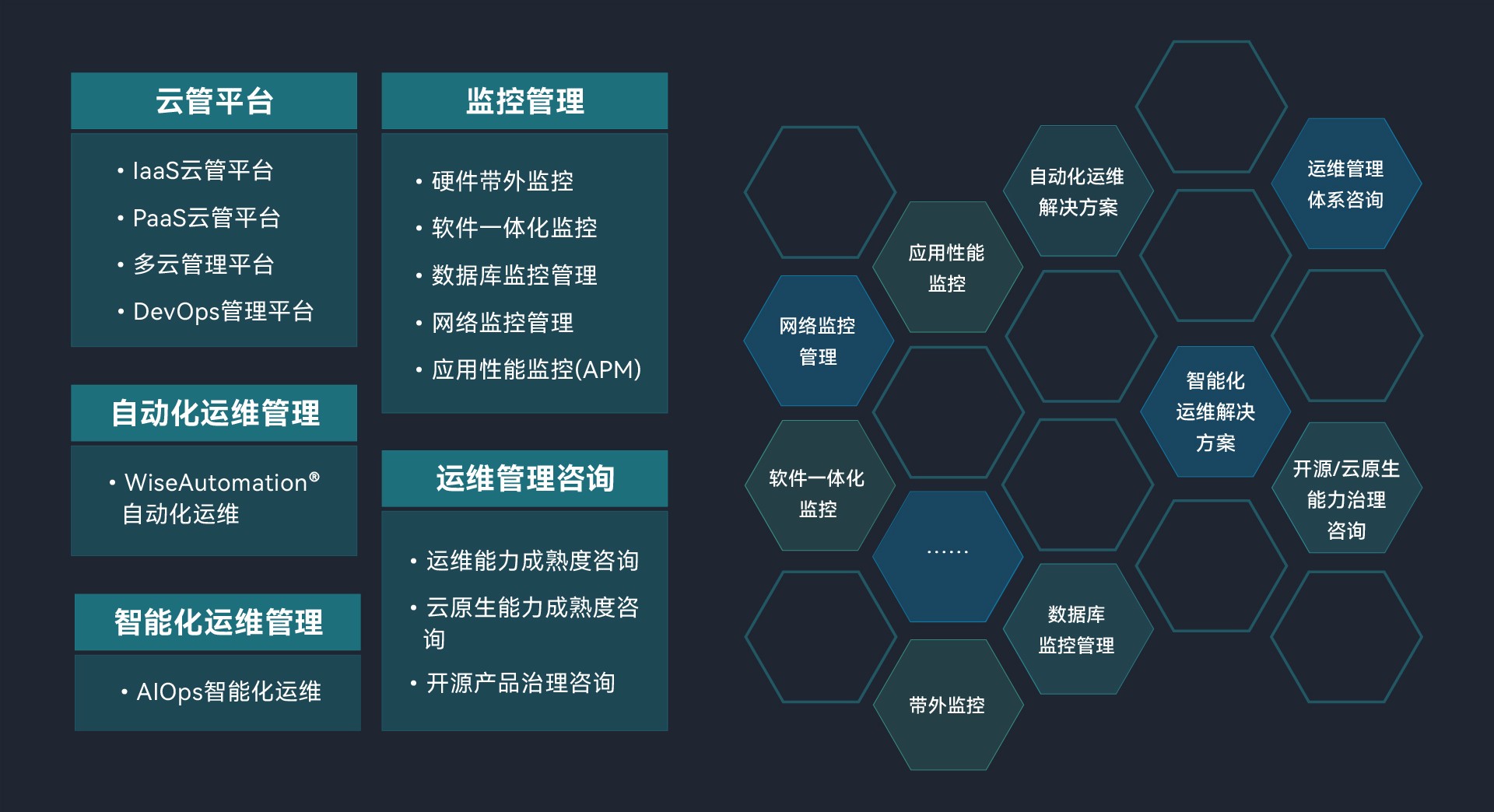 网思科技在运维管理产品领域提供硬件、软件监控、自动化运维、智能化运维和安全管理等产品解决方案,帮助客户实现对基础设施、应用程序和服务的全方位监控、反馈和管理。同时,网思科技在运维支撑平台领域提供云、大数据和智能平台中台解决方案,为客户打造基础设施管理平台,确保客户在各类运维需求下,都能够得到充分的支撑和保障。