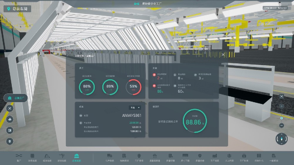 生产制造管理:结合实时生产数据,在3D场景中实时获知生产运营的KPI数据和状态。同时当出现异常时,对各类报警信息进行处理和自动报警,定位到3D场景,及时获知运行风险,通过3D动态方式进行故障处理和远程干预。